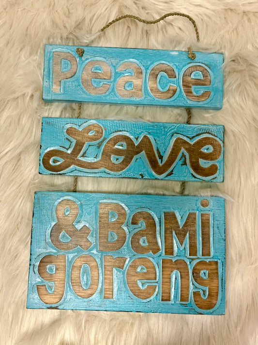 Wandbord Peace, love & nasi goreng/bami goreng/soto ayam